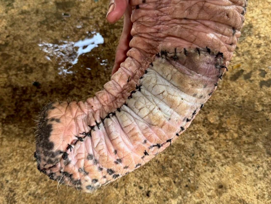 Unfortunately, suturing a trunk wound in elephants is extremely challenging due to its constant movement and critical role in daily functions. Despite diligent daily wound care, necrotic tissue was observed on the fourth day post-surgery, and most of the sutures had failed. This case served as a valuable lesson for the CMU team highlighting both the delicate anatomy of the elephant trunk and the limitations of conventional suturing techniques. The team will continue monitoring her recovery and adjust the wound management approach to support natural healing while maintaining her comfort and trunk function.