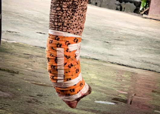 Early in the month, an owner called the team to examine a 7-year-old female elephant that had stepped on a nail. The mahout reported that he had immediately removed the nail, which was long, narrow, and covered with rust. Upon examination, they found only a small scratch-like wound on the sole of the left hind foot, and the elephant was still bearing weight normally. The veterinarian attempted to explore the wound but found no open tract. A tetanus toxoid vaccine was administered as a precaution. Unfortunately, about four weeks later, the camp manager contacted the CMU team again to report that the wound had developed into a foot abscess. The elephant was now severely lame, and the abscess had ruptured near the site of the nail injury. She was unable to place her heel on the ground and instead rested her front nail while walking.