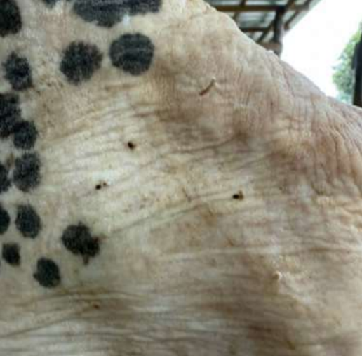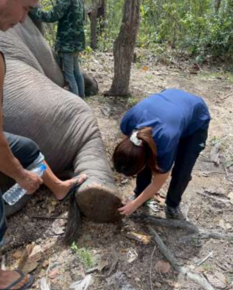 Later in the month, the CMU team was called to check on two elephants who had been experiencing pruritus (itchy skin) and frequently rubbing their bodies against trees. History-taking and a physical examination revealed multiple skin lesions located behind the ears, on the legs, and on the hips, along with a heavy infestation of lice particularly noted behind the ears. An intramuscular anti-parasitic medication was administered, and the owner was advised to bathe the elephants thoroughly and brush the affected areas or apply an appropriate anti-louse treatment.