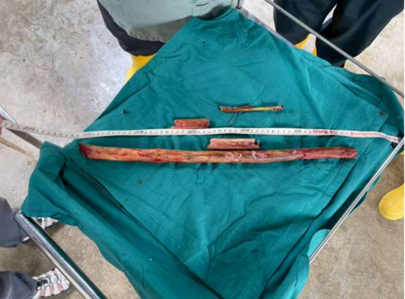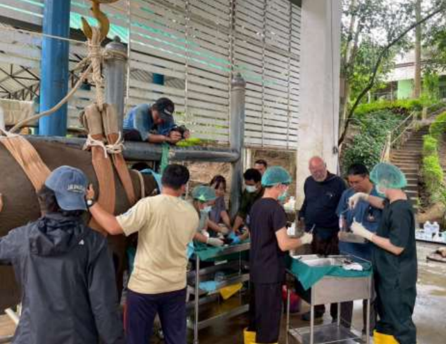 Last month we told you about the CMU Mobile Vet team visiting a 5-year-old female to diagnose a blocked nasal passage with a foreign object. On November 6, 2025, the CMU veterinarian participated in a surgical procedure to remove that foreign body. The case was first examined on October 29, 2025, when radiographic imaging revealed a solid, elongated object lodged in the right nasal passage. The surgical team at the elephant hospital, Lampang planned and successfully performed the operation to remove the foreign body, with the mobile clinic vet assisting in monitoring vital signs throughout the procedure. The surgery was successful, and a wooden stick approximately 50 cm in length was removed. The wound was then closed, and a postoperative care plan was implemented.
