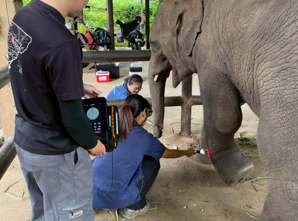 A 3-year-old juvenile elephant presented with swelling of the left carpal region following a slip in the forest. The swelling had persisted for approximately one week, though the elephant exhibited minimal stiffness and maintained functional use of the limb. Therapeutic management included the application of Class IV laser therapy in swelling and tendinitis mode to reduce inflammation and promote recovery. Additionally, a topical spray was prescribed to be applied to the affected area to assist in reducing swelling.