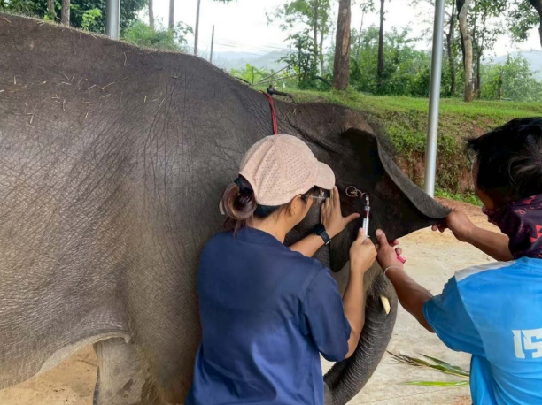 The veterinarian visited Mae Wang to perform health examinations on two subadult elephants, aged 6 and 7 years, that have been enrolled in a research project involving biweekly blood collection over the course of one year. Both elephants were found to be in normal body condition, with unremarkable physical examinations and vital parameters within the preferred ranges. Hematology results were also normal. Notably, over the course of the study, both elephants demonstrated increasing cooperation during the medical procedures. They were calm and stood still during blood draws, showing no apparent fear or distress compared to the initial sessions. For the veterinarians, this observation highlights the importance of early training for young elephants to facilitate routine veterinary procedures such as blood collection, which is critical for effective health monitoring and disease surveillance.